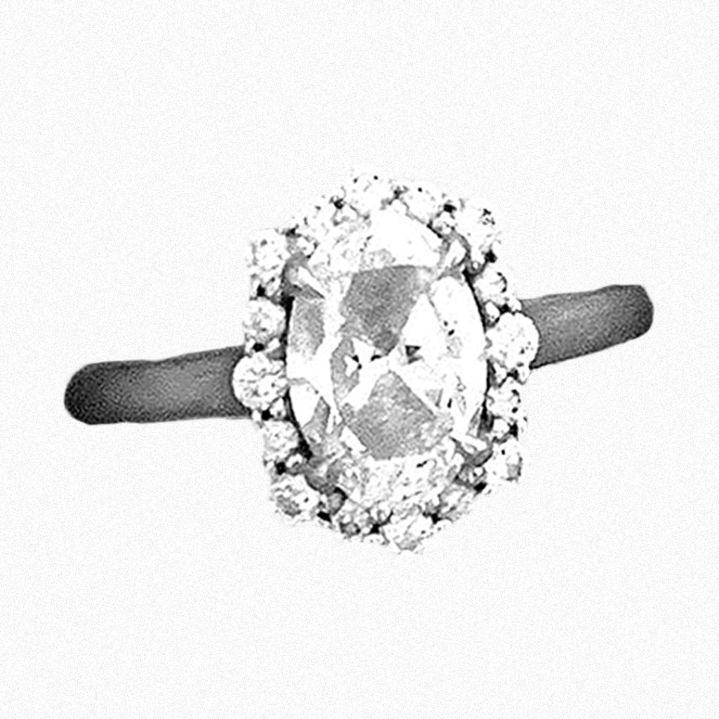 His thick, leathered fingers pinched and sprouted a tiny, white gold ring. It was a bold oval solitaire diamond, framed by a halo of small, sugar-like diamonds that were patterned imperfectly to give it a vintage, etched border. A plain band gave the diamond all the more drama. I’d never seen anything like it.