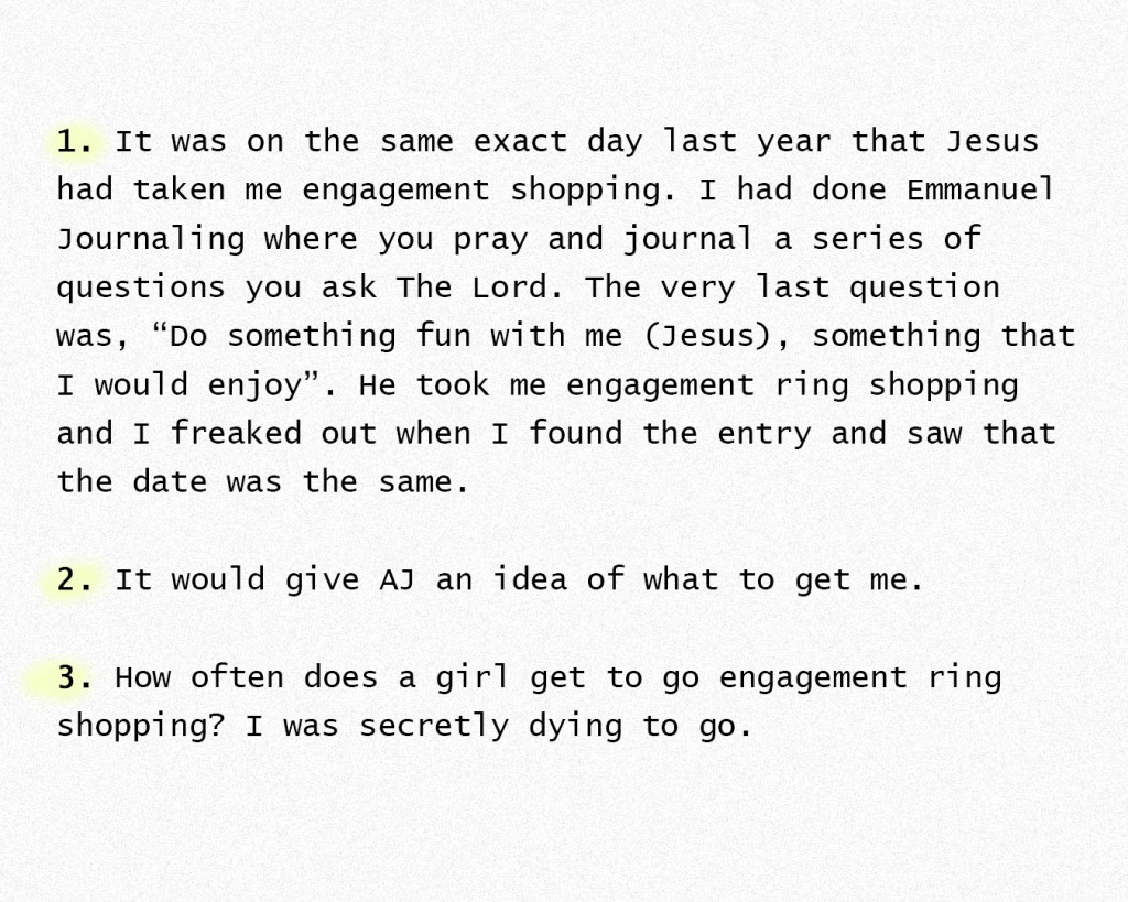 I repeated how I always wanted my engagement ring to be a surprise, hand-picked by my future husband, but God knew me better than that. If the ring was wrong it would wreck the whole thing—not ‘cause the ring is the most important part—but because it would be hard for me to look past. It would’ve broken my heart to genuinely not be able to like it. It’s a different story than I ever would’ve chosen, but it’s better.